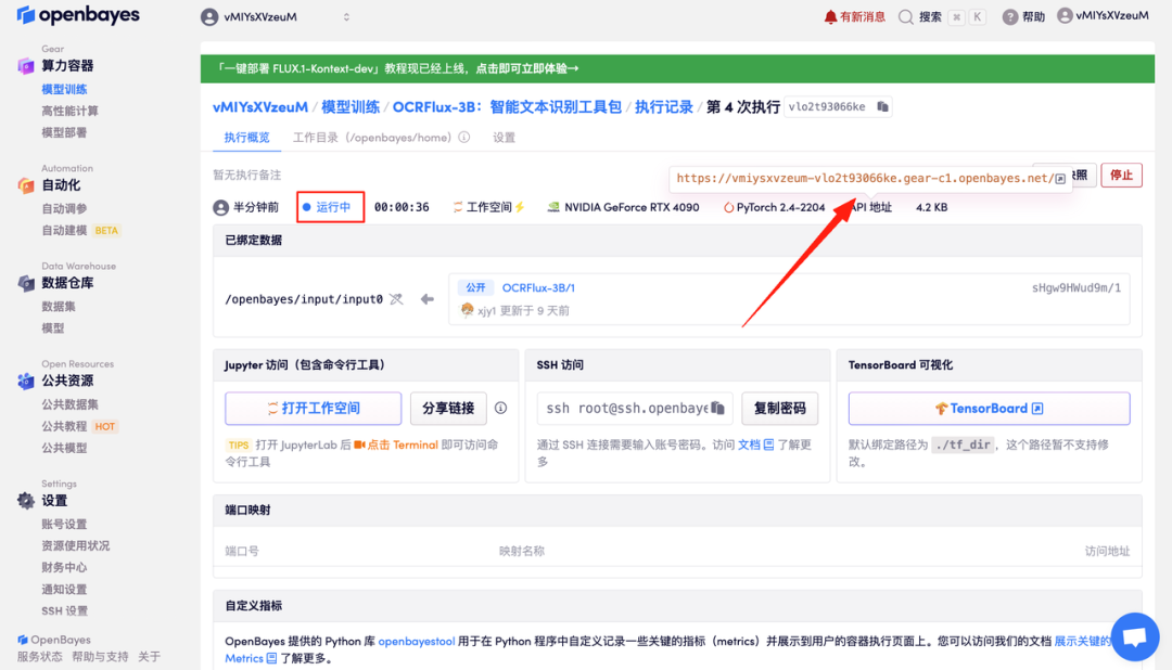 4.等待分配资源,首次克隆需等待 2 分钟左右的时间。当状态变为「运行中」后,点击「API 地址」旁边的跳转箭头,即可跳转至 Demo 页面。请注意,用户需在实名认证后才能使用 API 地址访问功能。