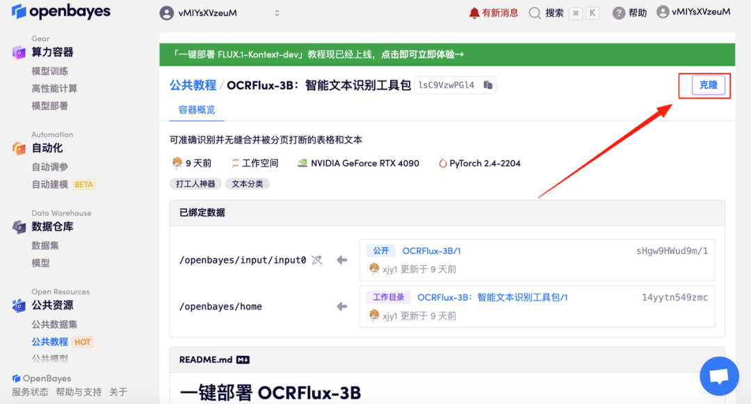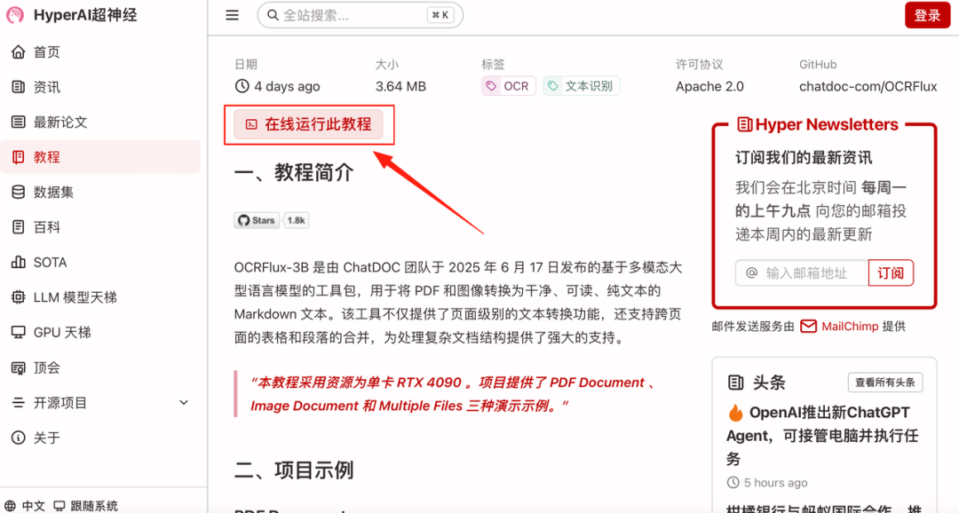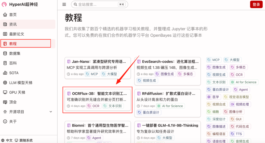 1.进入 hyper.ai 首页后,选择「教程」页面,并选择「OCRFlux-3B:智能文本识别工具包」,点击「在线运行此教程」。