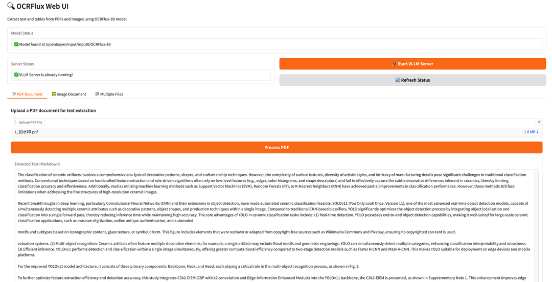 目前,「OCRFlux-3B:智能文本识别工具包」已上线至 HyperAI超神经官网(hyper.ai)的教程板块,一键部署即可在线体验将 PDF Document 、Image Document 和 Multiple Files 转换为可检索的 Markdown 文本,快来体验吧~