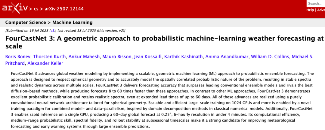 相关研究成果以「FourCastNet 3: A geometric approach to probabilistic machine-learning weather forecasting at scale」为题,发表于 arXiv。