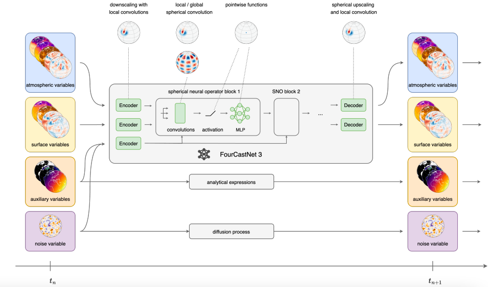 FourCastNet 3(FCN3)作为一款概率模型,由一个编码器、一个解码器和 8 个神经算子块组成,基于隐马尔可夫模型框架,给定某一时刻 tₙ 的 0.25° 网格大气状态 uₙ,模型能预测 6 小时后 tₙ₊₁ 的状态 uₙ₊₁=F_θ(uₙ, tₙ, zₙ),其中随机性通过随机噪声向量(noise variables) zₙ 引入——zₙ 来自多个具有不同空间-时间尺度的球面扩散过程采样,以此捕捉大气演化的不确定性。