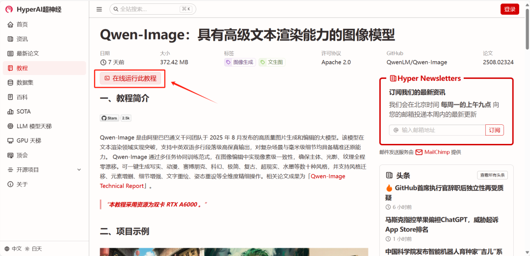 1. 进入 hyper.ai 首页后,选择「教程」页面,并选择「Qwen-Image:具有高级文本渲染能力的图像模型」,点击「在线运行此教程」。
