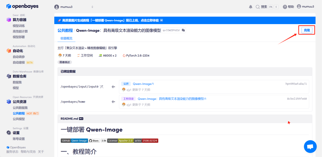 2.页面跳转后,点击右上角「克隆」,将该教程克隆至自己的容器中。