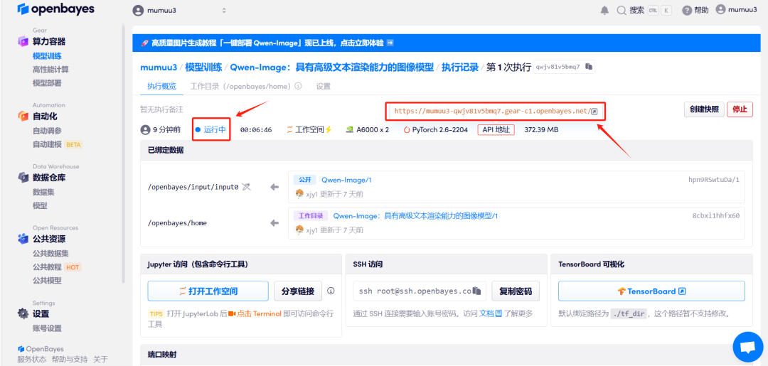 4.等待分配资源,首次克隆需等待 3 分钟左右的时间。当状态变为「运行中」后,点击「API 地址」旁边的跳转箭头,即可跳转至 Demo 页面。请注意,用户需在实名认证后才能使用 API 地址访问功能。