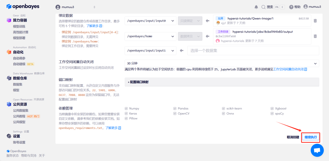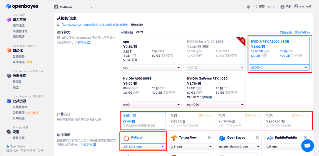 3. 选择「NVIDIA RTX A6000 48GB」以及「PyTorch」镜像,按照需求选择「按量付费」或「包日/周/月」,点击「继续执行」。新用户使用下方邀请链接注册,可获得 4 小时 RTX 4090 + 5 小时 CPU 的免费时长!