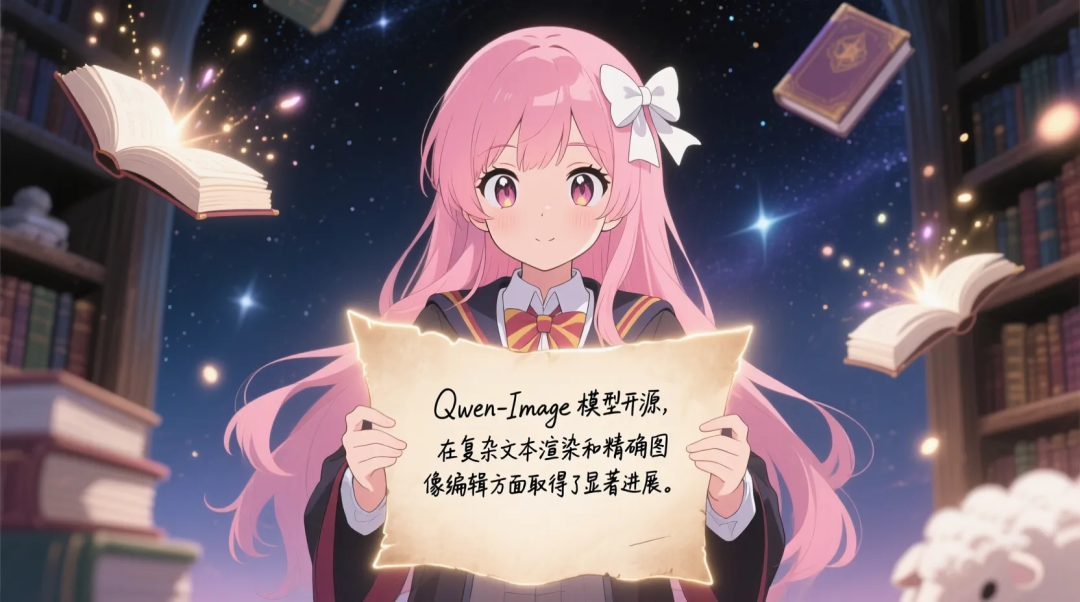 Prompt:一个二次元风格的女孩,精致动漫脸,眼睛闪亮,粉色长发、戴有白色蝴蝶结发饰。手持发光羊皮纸,纸上工整手写「Qwen-Image 模型开源,在复杂文本渲染和精确图像编辑方面取得了显著进展。」,服装为魔法学院制服,背景为星空书房、悬浮魔法书,带有粒子光效。吉卜力画风,柔光滤镜,景深虚化。
