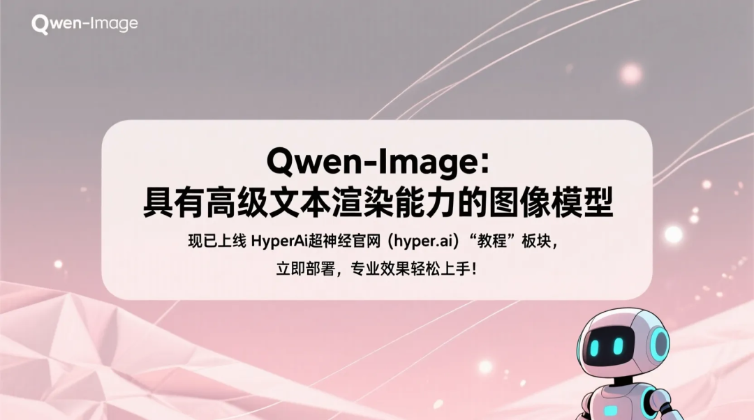 Prompt:平面海报设计,背景采用莫兰迪色系的渐变柔光处理,主色调以灰粉色为基底,叠加雾霾粉与燕麦白的层次过渡,核心文字采用居中排版结构:「Qwen-Image:具有高级文本渲染能力的图像模型」现已上线 HyperAI超神经官网(hyper.ai)的「教程」板块,立即部署,专业效果轻松上手!装饰元素采用抽象几何线条沿主色调延伸,卡通风格动漫机器人在背景,与细微光粒子及纸张褶皱纹理相互呼应,同时确保文字边缘锐利无锯齿。