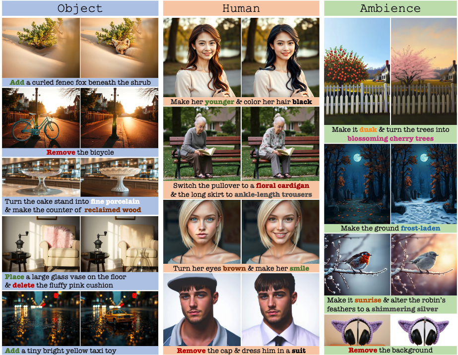 NHR-Edit 是一个图像编辑数据集,旨在支持训练能够遵循多样化自然编辑指令的通用图像编辑模型。该数据集包含 286,608 张唯一源图像和 358,463 个图像编辑三元组。每个样本还包含编辑类型、样式和图像分辨率等额外元数据,使其适合训练细粒度、可控的图像编辑模型。