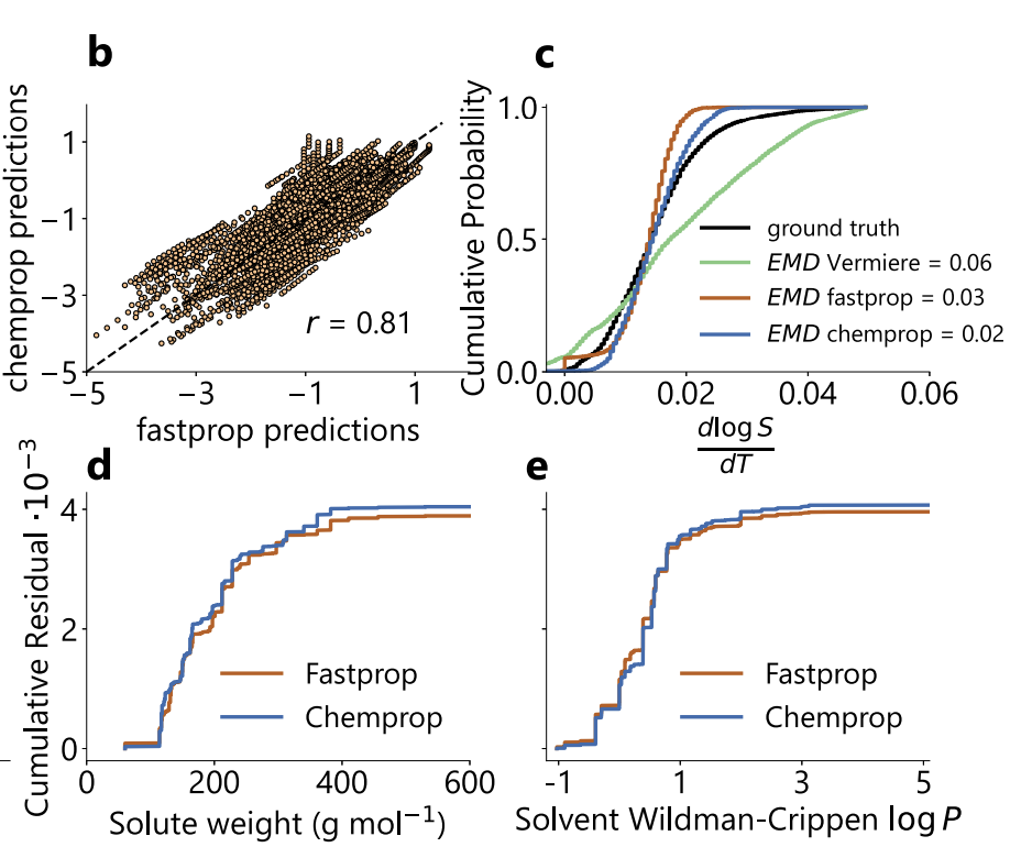 此外,如下图所示,两模型在 SolProp 测试集上预测高度相关(Pearson r=0.81),温度梯度预测分布亦高度一致(EMD=0.03/0.02),系统误差显著低于 Vermeire 模型(EMD=0.06)。