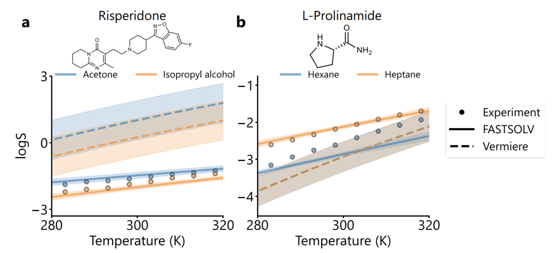 研究还发现,在典型溶质验证中,如下图所示,FASTSOLV 对利培酮(RMSE=0.16 vs Vermeire 1.64)和 L-脯氨酰胺(RMSE=0.25 vs Vermeire 2.33)的预测优势明显,不仅能正确判断溶剂溶解度顺序与温度依赖,还可区分结构相似的己烷与庚烷。失败模式分析显示,蒽醌类预测误差较高,但在 85 个蒽/蒽醌衍生物子集中,模型整体 RMSE=0.52,且能稳定排序溶剂溶解度,说明分子表征具备合理性。