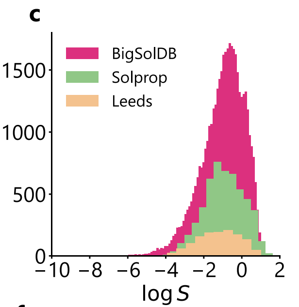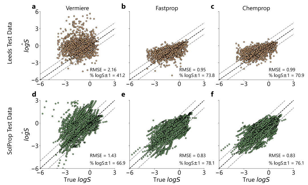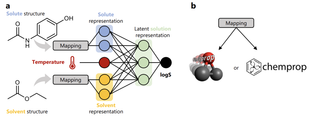 针对这一痛点,美国麻省理工学院研究团队结合化学信息学工具与全新有机溶解度数据库 BigSolDB,在 FASTPROP 与 CHEMPROP 模型架构的基础上进行了改进,使模型能够同时输入溶质分子、溶剂分子及温度参数,直接对 logS 进行回归训练。