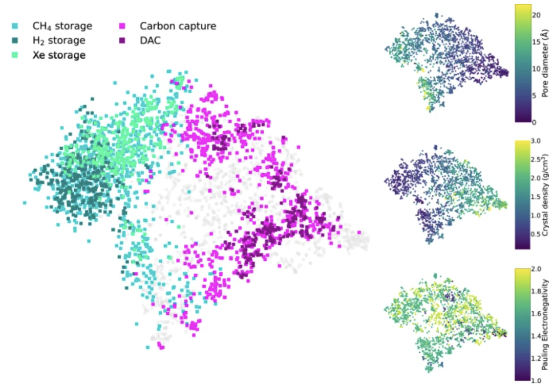 基于模型的出色表现,研究人员构建了一个可视化的潜在应用推荐系统,能够根据预测的材料性能将新合成的 MOFs 与潜在应用(如气体储存、碳捕获等)进行匹配。其使用 t-SNE 技术获取模态模型潜在空间的投影,用颜色表示金属有机骨架 (MOFs) 的推荐应用。下图展示了将合成信息映射至应用场景:
