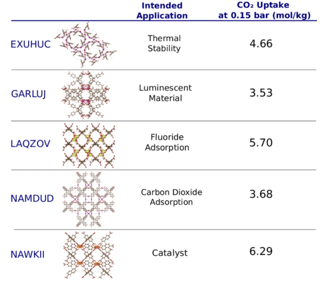 为了验证模型对未来材料应用的预测能力,研究者们进行了一项时间回溯实验(time-travel experiment)。使用 2017 年之前存储在 CSD 数据库中的 CoRE-2019 条目训练模型,并使用 2017 年之后存储的条目作为测试集,以此模拟对未来材料的预测。实验的目标是预测这些 MOFs 在二氧化碳吸附这一特定应用中的表现,结果显示,模型成功地识别出了 18 种有潜力用于碳捕获的 MOF,这 18 种 MOF 中,有 15 种原本是为其他应用而设计的。