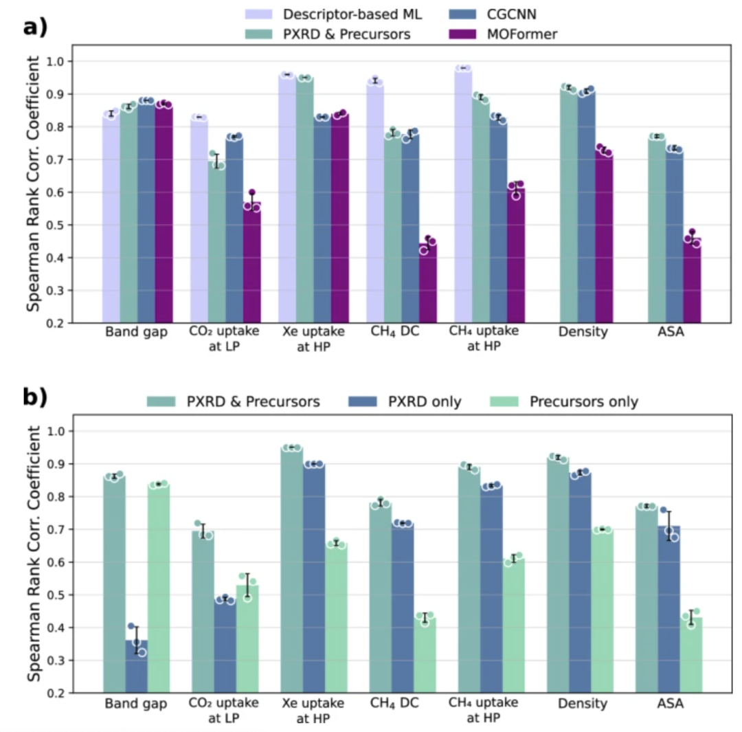 为了证明模型可以有效预测各种 MOFs 特性,为 MOFs 合成与应用相结合奠定基础,研究团队对模型的准确性进行了评估,用斯皮尔曼等级相关系数(SRCC)和平均绝对误差(MAE),评估模型在几何依赖性能、化学依赖性能和量子化学性能上的预测精度,并与 CGCNN 、 MOFormer 和基于描述符的机器学习模型进行基准对比。