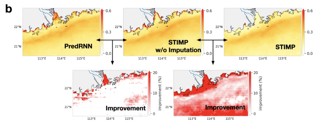此外,填补数据后 STIMP 对分布的预测效果显著提高。在缺失数据率较高的地区,STIMP 的预测结果往往比 PredRNN 的预测结果改善更大,证明了预测前填补数据有助于 STIMP 有效捕捉叶绿素 a 的空间分布和季节性信号。