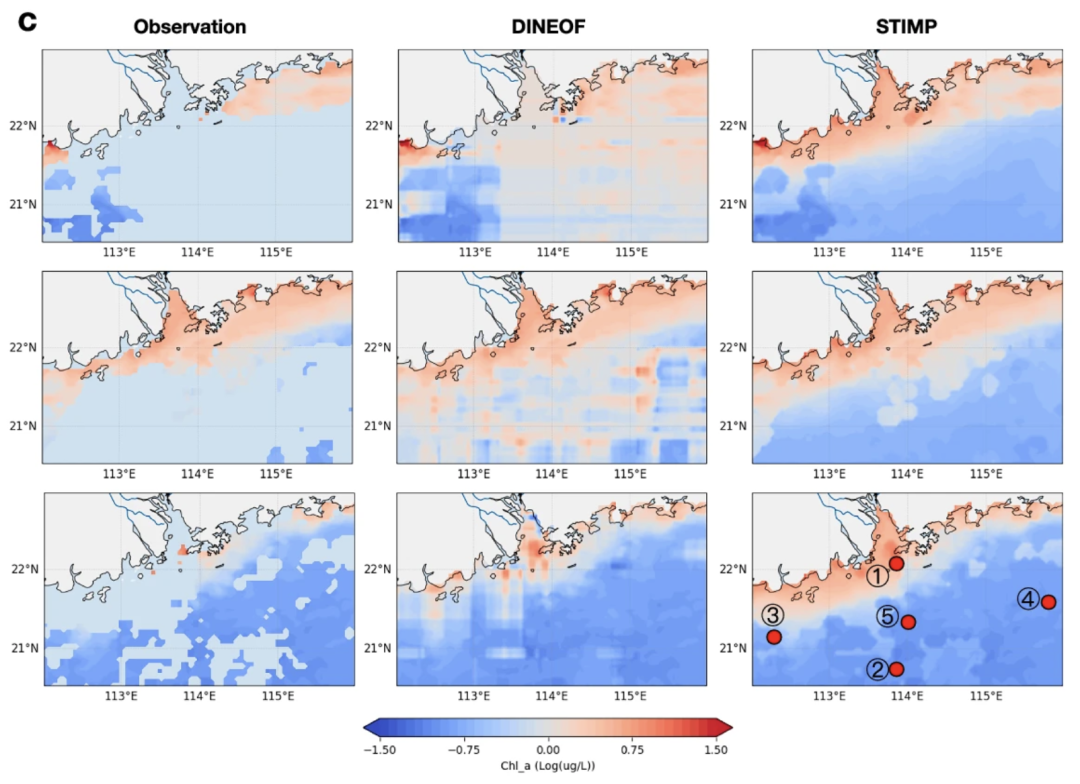 该研究以珠江口为例,证明了 STIMP 模型时空插补的有效性。研究人员选取了 2015 年 2 月 7 日至 2016 年 2 月 2 日珠江口全域的观测数据,并利用 STIMP 和包括数据插值经验正交函数(Data Interpolating Empirical Orthogonal Function, DINEOF)、掩码自编码器(MaskedAE)、线性插值(Lin-ITP)在内的基线方法,重建了叶绿素 a 分布数据。