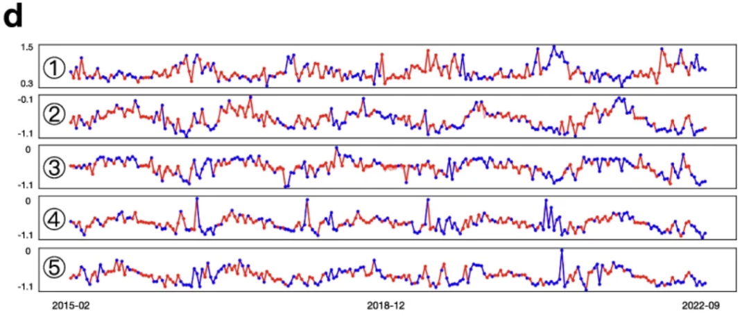 此外,STIMP 在插补过程中有效地保留了时间关系。在对从 2015 年 2 月 7 日到 2022 年 9 月 22 日 5 个单一位置进行插补的过程中,与简单的线性插值相比,STIMP 包含了更多的波动。
