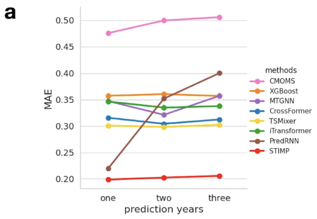 研究人员还通过预测实验验证了 STIMP 的长期预测性能优势。STIMP 1 年预测的平均绝对误差(MAE)较基线方法降低了 6.54% 至 13.68%, 2 年预测则降低了 13.68% 至 32.25%, 3 年预测降低了 13.77% 至 32.01%,优于其他预测方法。