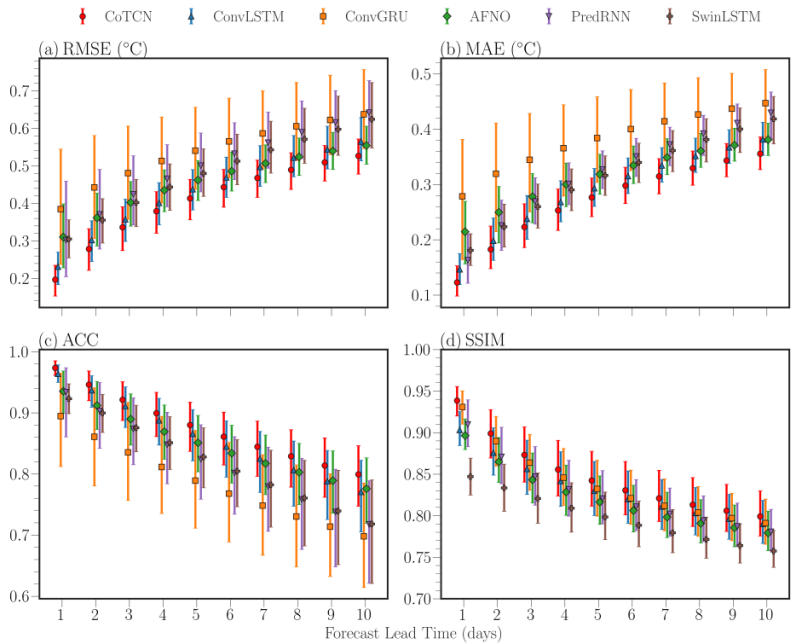 研究基于 NOAA OISST v2 全球海洋数据进行了全面验证,数据覆盖 1982-2022 年共 40 年时间序列。在国产 DCU 算力平台上的测试结果显示,CoTCN 与 ConvLSTM、ConvGRU、AFNO、PredRNN、SwinLSTM 等主流模型相比展现出明显优势。