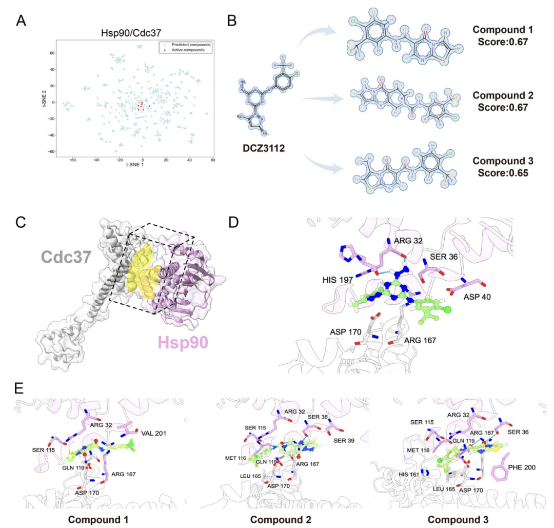 在实际应用验证中,该研究还以界面结构明确且为抗癌关键靶点的 Hsp90-Cdc37 PPIs 为对象,如下图 A 所示,AlphaPPIMI 筛选 ChemDiv 库中预测分数>0.8 的化合物,其化学空间与已知活性抑制剂分布接近;如下图 B 所示,研究人员以已验证抑制剂 DCZ3112 为参考,经结构相似性与药效团分析筛选出 3 个候选化合物;如下图 D–E 所示,分子对接显示这些化合物可与 Arg32、Ser36 等关键残基形成类似参考分子的相互作用,提升其抑制剂潜力。