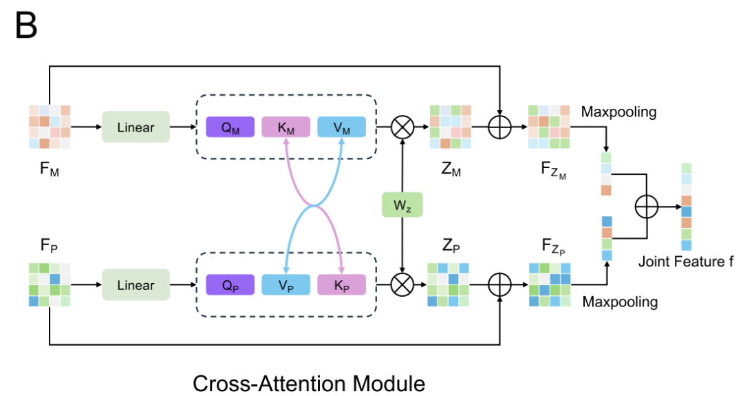 为了建模蛋白质与调节剂之间的复杂相互作用,如下图所示,AlphaPPIMI 设计了双向交叉注意力模块(Cross-Attention Module)。这个模块先对调节剂特征矩阵 FM 和靶点特征矩阵 FP 做线性变换,再输入注意力子模块,从而实现键-值对层面的双向信息交换:PPIs 特征会通过调节剂来源的注意力权重优化,调节剂特征则借助 PPIs 驱动的注意力机制调整。模块中还加入了残差连接和最大池化操作,能在保留各模态特有信息的同时,动态学习两者的相互作用模式,最终输出更全面的相互作用表征。