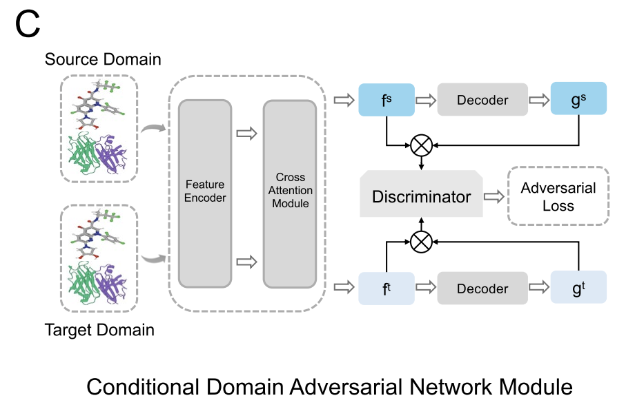 考虑到不同数据集的特征分布存在差异,比如 DiPPI 主要关注界面靶向调节剂,而 DLiP 这类通用数据集却缺乏此类信息,如下图所示,AlphaPPIMI 还引入了条件域对抗网络(CDAN,Conditional Domain Adversarial Network)。CDAN 以 「特征嵌入与分类预测的联合表征」 作为域判别器的条件,既能保留有判别价值的特征,又能实现源域与目标域间的分布对齐。训练过程采用极小极大博弈:特征提取器(Feature Encoder)和交叉注意力模块负责生成域不变表征,鉴别器则用来区分特征的来源。这一机制大幅提升了模型在不同蛋白质家族间的泛化能力,为识别新颖的界面靶向调节剂提供了更稳健的支持。