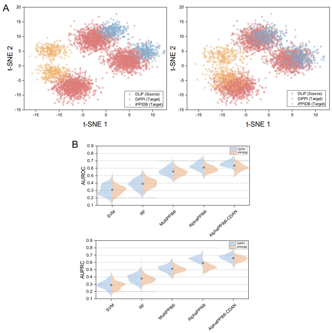 实验结果显示,所有模型在领域偏移下性能均下降,但 AlphaPPIMI 稳健性更强,其在 DiPPI 上的 AUROC 与 AUPRC 显著高于 MultiPPIMI,跨域与域内性能差距凸显领域自适应策略的必要性。如下图所示,研究进一步提出 AlphaPPIMI-CDAN 架构,通过条件特征对齐实现跨域分布适配,该模型在 DiPPI 与 iPPIDB 上全面优于基准模型;不同于传统边缘对齐方法,其依据类别条件分布指导特征对齐,生成更具判别性的表征,可有效应对 PPIs 领域功能性细微差异带来的分布偏移,同时减轻负迁移以提升跨域预测稳健性与泛化能力。
