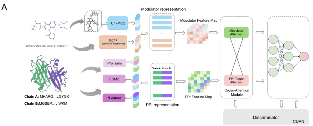AlphaPPIMI 框架:多源特征提取、双向交叉注意力及 CDAN 泛化优化