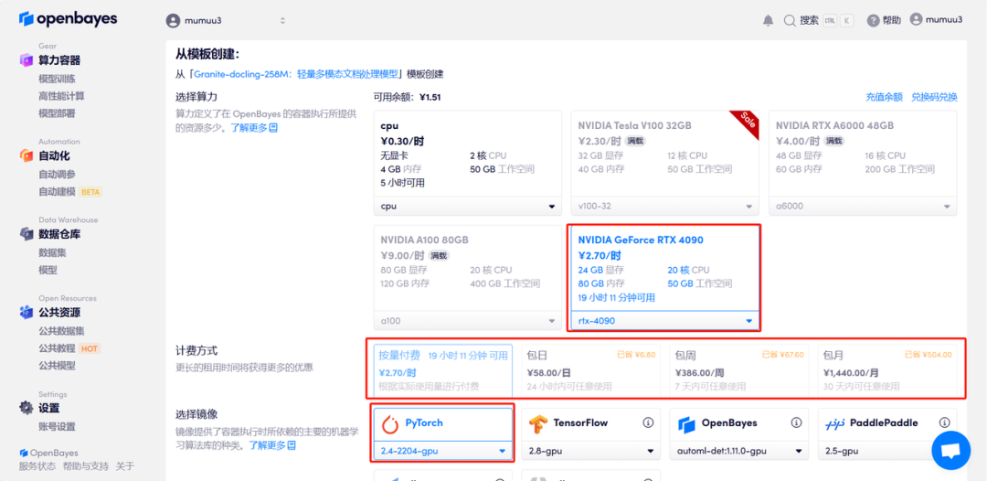 3. 选择「NVIDIA GeForce RTX 4090」以及「PyTorch」镜像,并点击「继续执行」。OpenBayes 平台提供了 4 种计费方式,大家可以按照需求选择「按量付费」或「包日/周/月」。新用户使用下方邀请链接注册,可获得 4 小时 RTX 4090 + 5 小时 CPU 的免费时长!