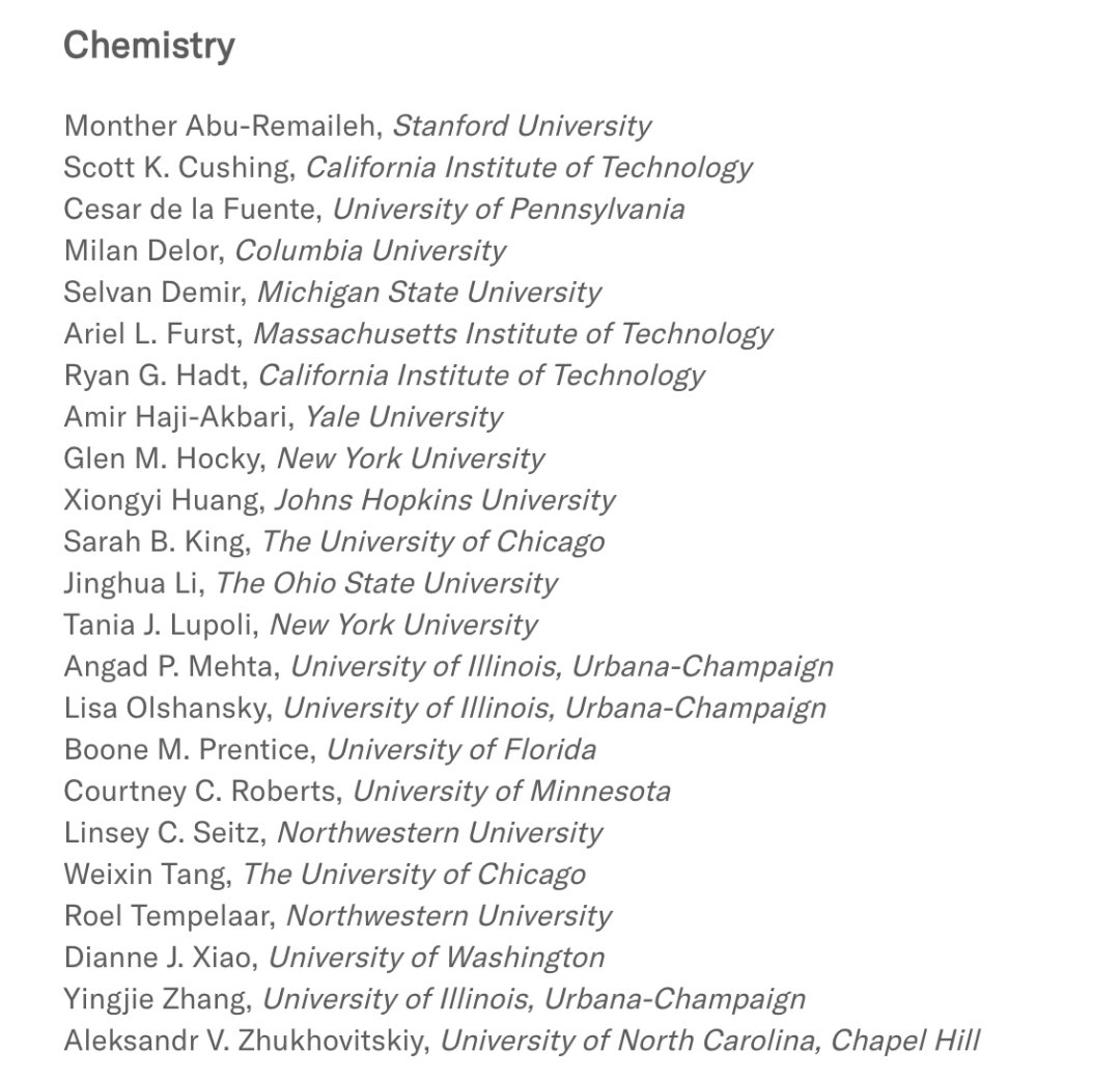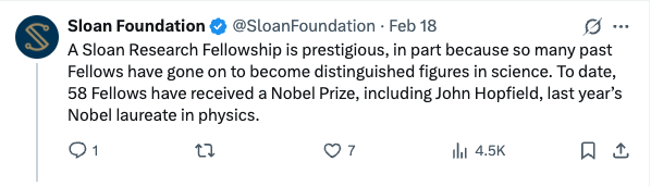 首先是斯隆研究奖(Sloan Research),该奖项设立于 1955 年,每年颁发一次,主要奖励职业生涯早期(通常是博士毕业后 2–6 年)的杰出青年科学家,覆盖物理学、化学、计算机科学、数学、神经科学、地球系统科学、经济学等领域,每位获奖者可获得为期两年的 75,000 美元奖学金,用于自由探索科学问题。