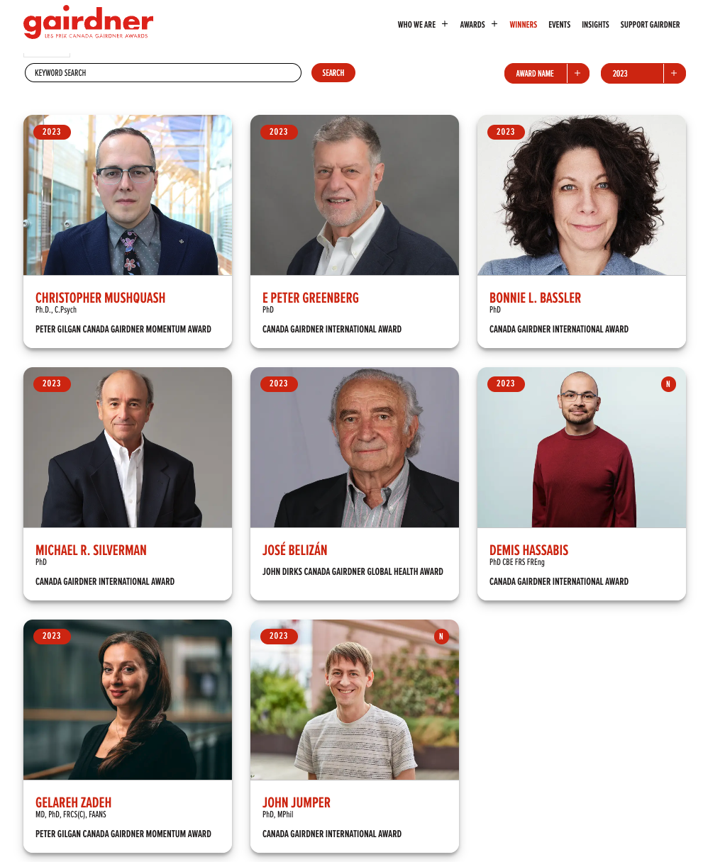 今年 4 月,新一届盖尔德纳奖的获奖名单正式公布,共有 8 位科学家获奖,具体名单如下图所示。其中,Gary Struhl、Spyros Artavanis-Tsakonas 和 Iva Greenwald 因在 Notch 信号通路方面的开创性工作而获奖,该研究显著推动了人类对细胞在发育过程中如何相互交流、这些信号如何调控细胞命运决定,以及其紊乱如何导致发育缺陷和癌症的理解。