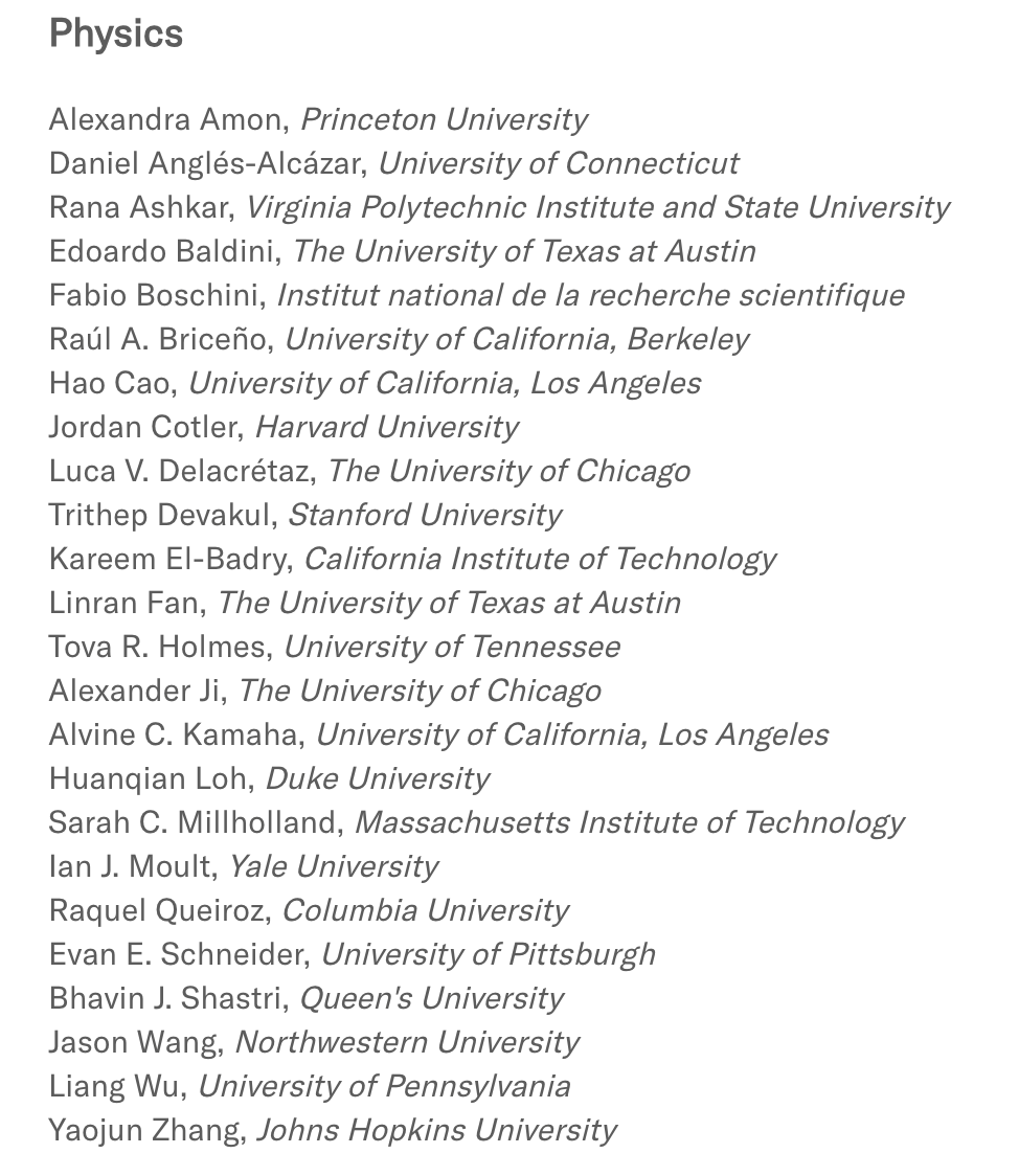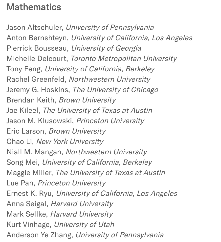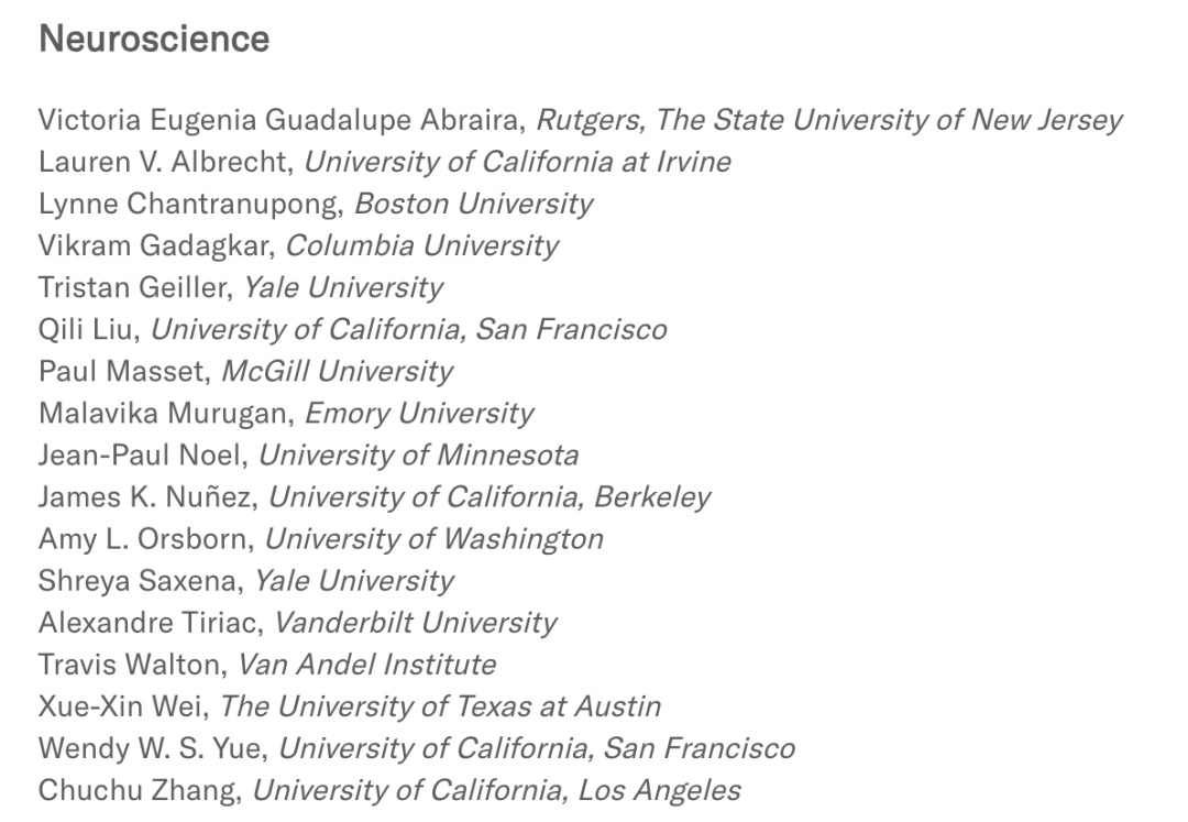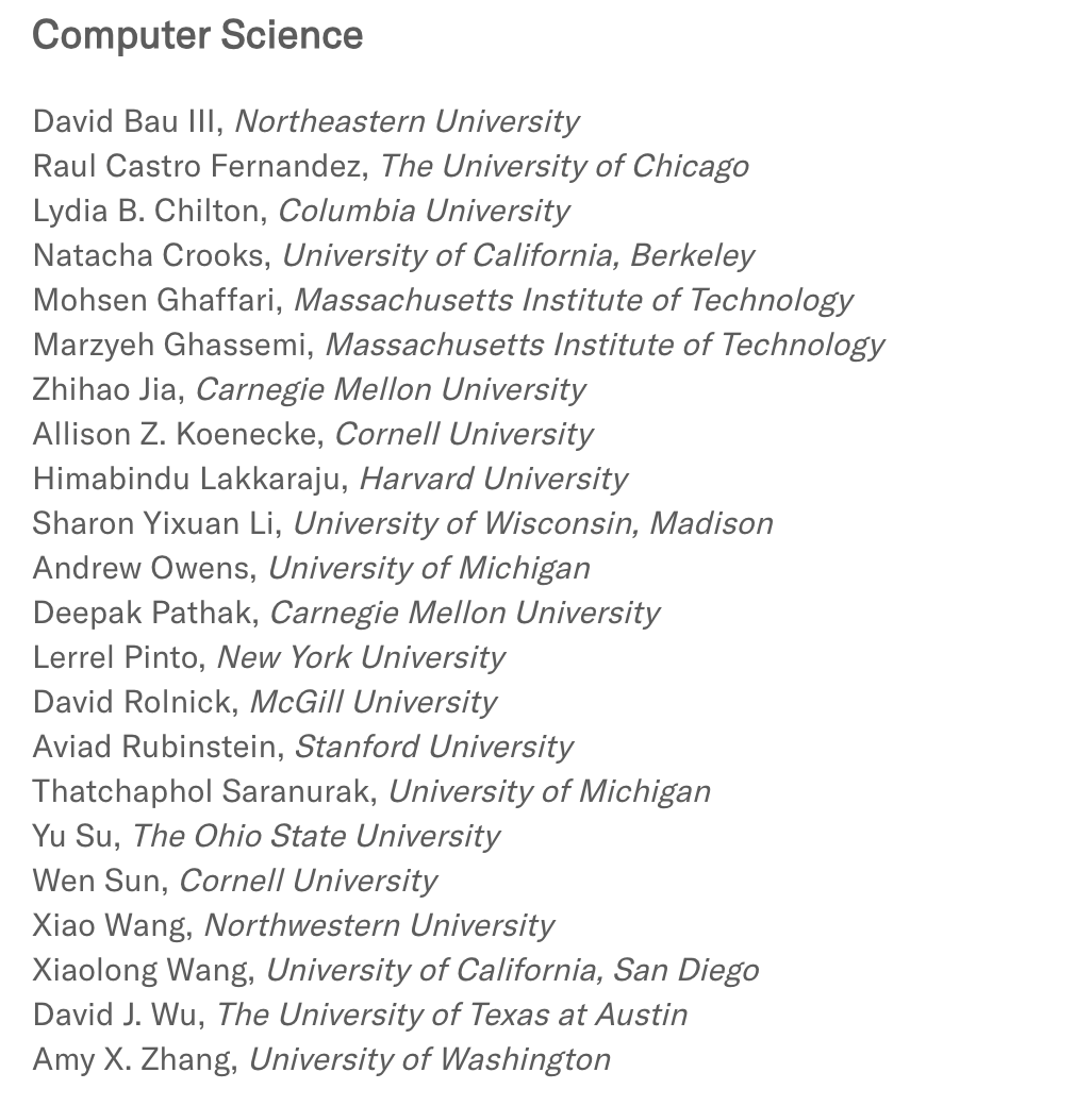 2025 年的斯隆研究奖获奖名单已于 2 月公布,共有 126 位学者当选,涉及化学、计算机科学、地球系统科学、经济学、数学、神经学、物理学。具体获奖名下如下所示: