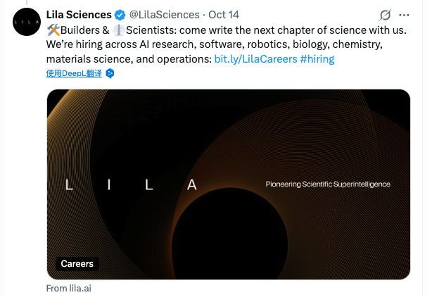 他们的招聘信息中写道:我们相信,人工智能领域最激动人心的前沿是科学,我们立志成为科学超级智能领域的领军者。关于团队文化 Lila 这样定义——「我们是一支在科学、人工智能和机器人领域拥有深厚专业知识的团队,致力于解决人类面临的最大挑战。」