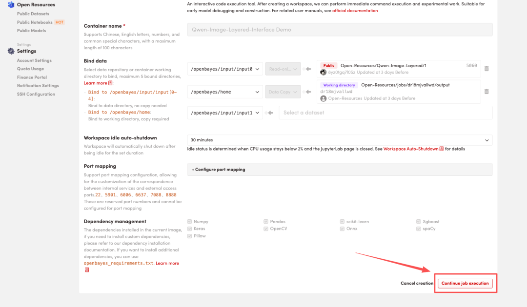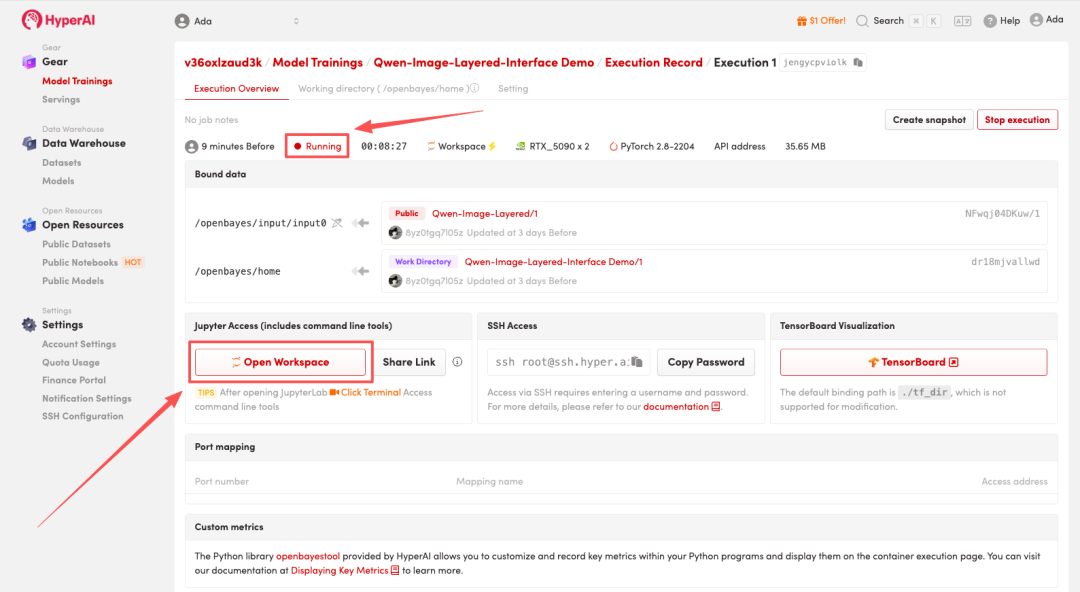 4.等待分配资源,当状态变为「Running(运行中)」后,点击「Open Workspace」进入 Jupyter Workspace。