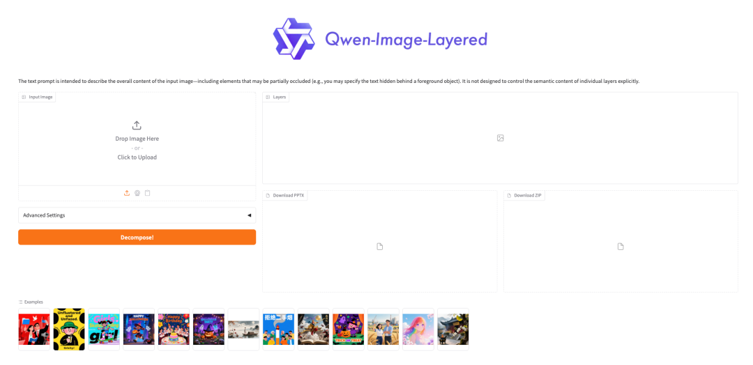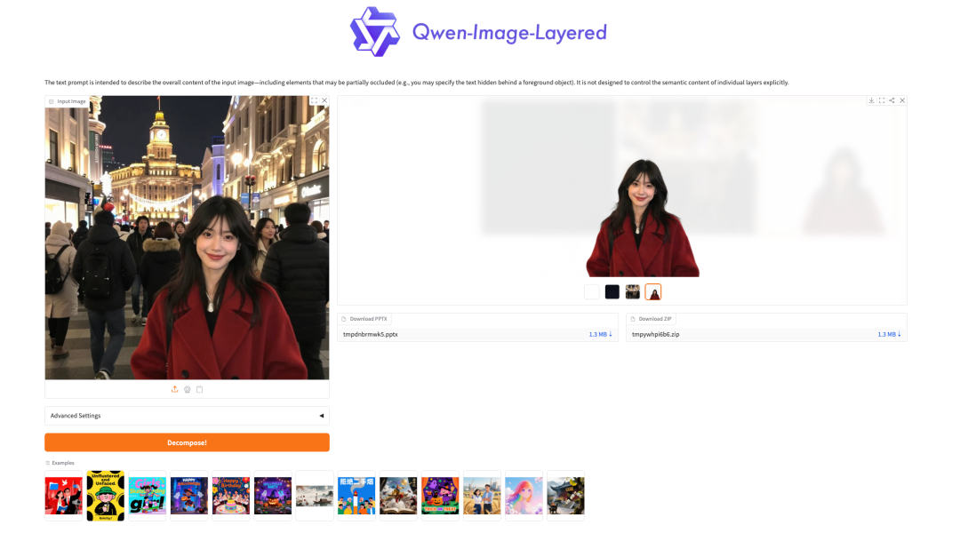 进入 Demo 运行页面后,上传图片,点击「Decompose」则开始进行图层分离,提供 PPT 与 PNG 图片两种下载格式。