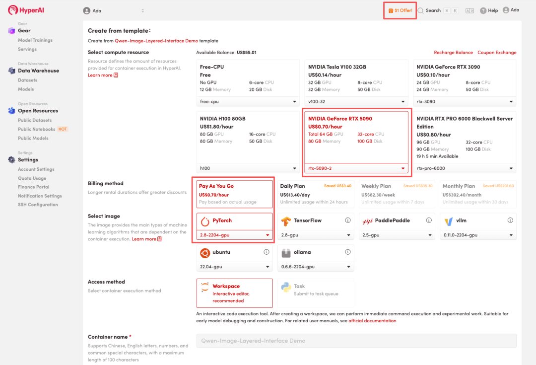 HyperAI 为新用户准备了注册福利,仅需 $1,即可获得 5 小时 RTX 5090 算力(原价 $2.45),资源永久有效。