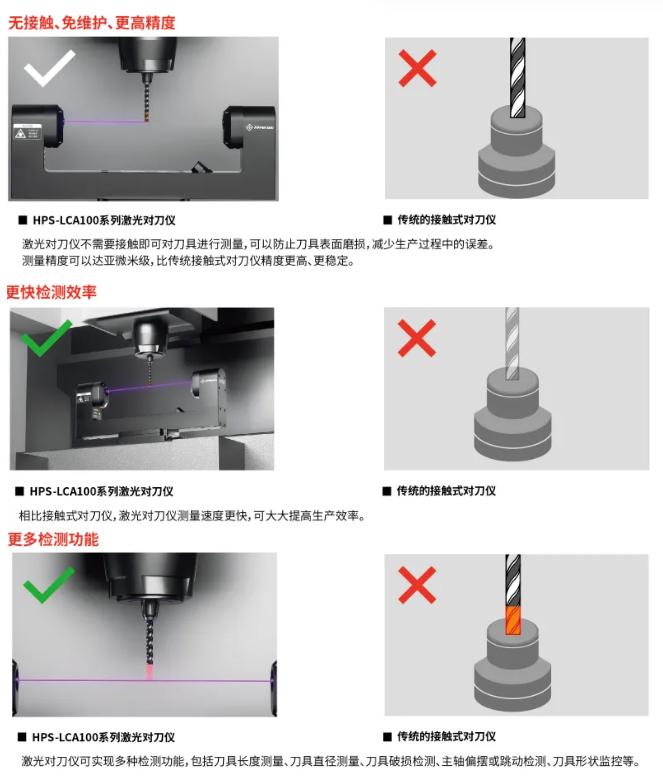 HPS-LCA100是最新一代采用聚焦的紫色激光光束为测量媒介的高精度激光对刀仪,自研的气封及精密光学系统保障了在CNC加工中心复杂工况下仍能实现稳定、迅速、精确的刀具测量