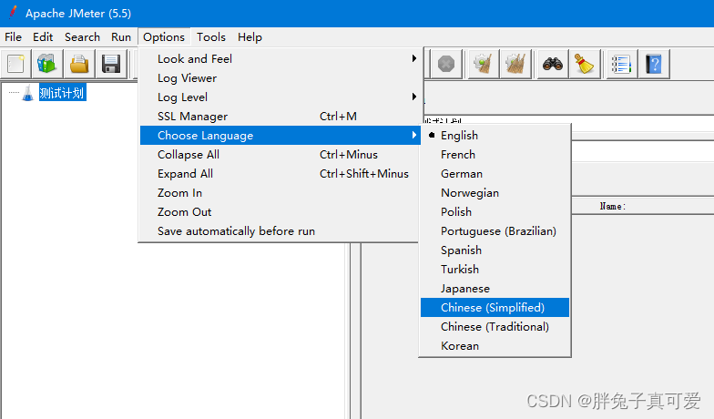 第一种,启动JMeter的GUI界面后,在顶部菜单栏的"Options“中更改语言为中文,但是这种更改不会保存,下次重新启动后,还是默认英语;