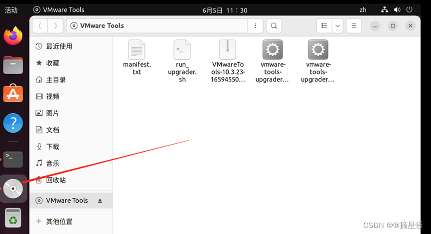 此时桌面有vmtoolsCD盘,双击打开VMware tools盘,然后将文件复制到或者提取到你要存放VMware tools文件的目录下。