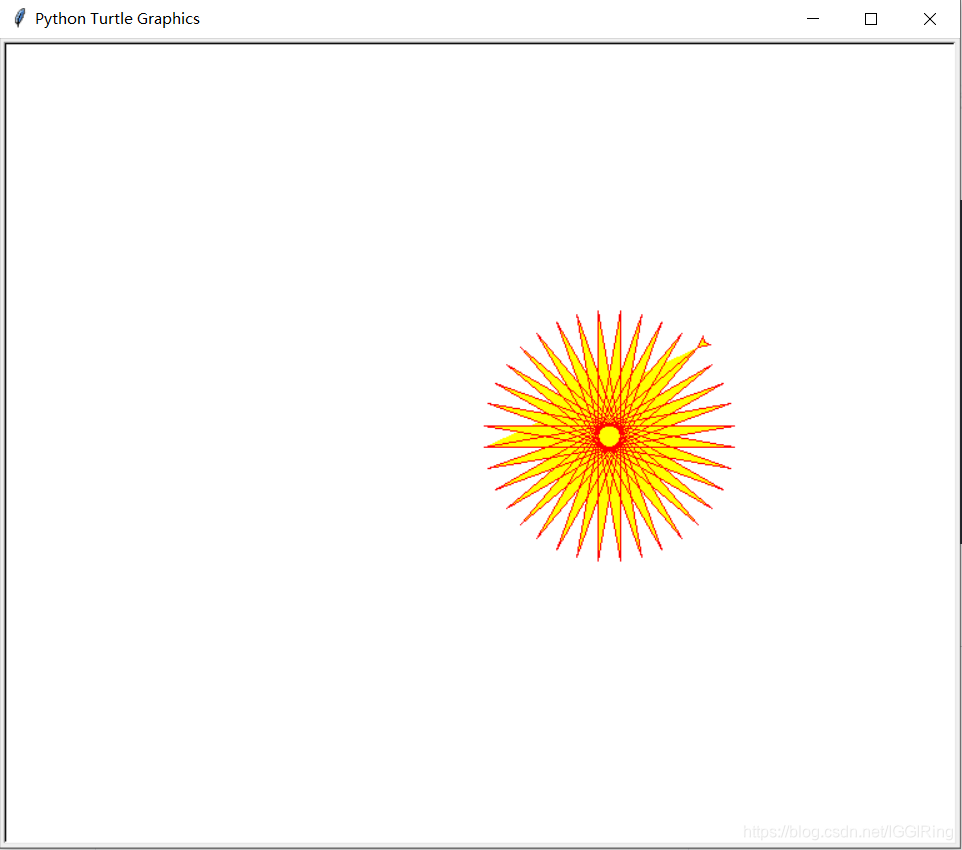 import turtle turtle=turtle.Turtle() screen=turtle.getscreen() turtle.color('red', 'yellow') turtle.begin_fill() for i in range(50): turtle.forward(200) turtle.left(170) turtle.end_fill() screen.mainloop()