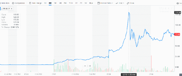 LongFin的股票自上周在纳斯达克交易所上市开始,价格就一路猛涨,第一天收盘价格为5.15美元。到周末,该股价格已经上涨至39美元,期间曾达到过129.84美元的高点,随后价格回调至72美元。这一上涨态势让该公司首席执行官也感到惊讶,他对彭博社表示: