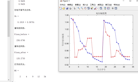 通过上述流程,我们得到了基于IEEE 33节点的配电网重构方案。该方案包括应打开的开关数以及对应的网络结构调整方案。同时,我们对比了重构前后的网损和电压结果。