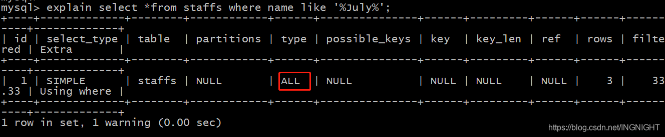 explain select *from staffs where name like '%July%';