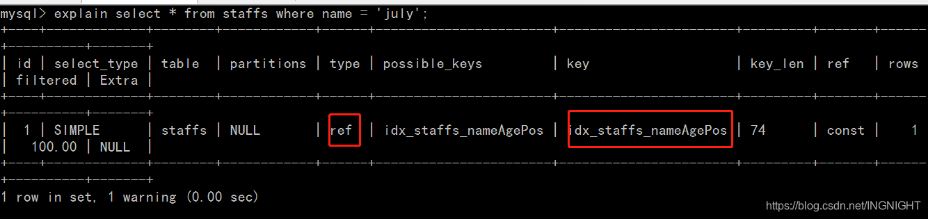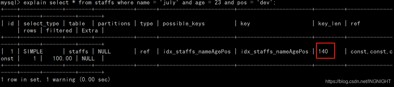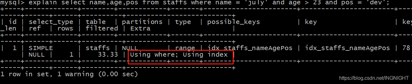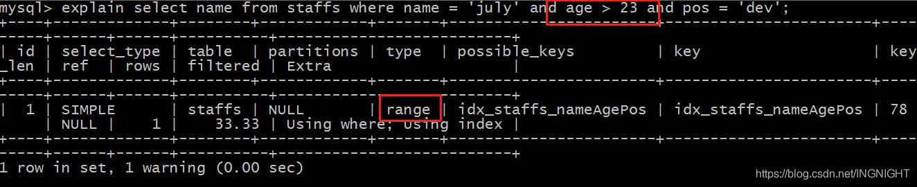 explain select name,age,pos from staffs where name = 'july' and age > 23 and pos = 'dev';