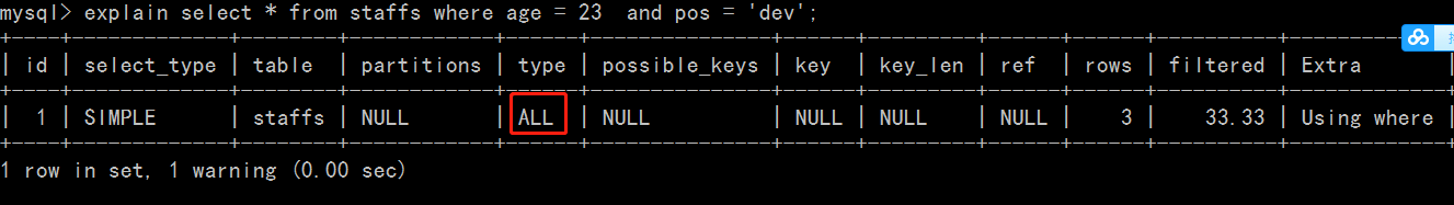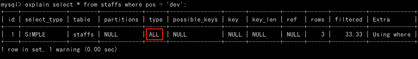 explain select * from staffs where name = 'july' and age = 23 and pos = 'dev';