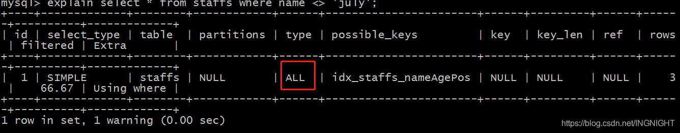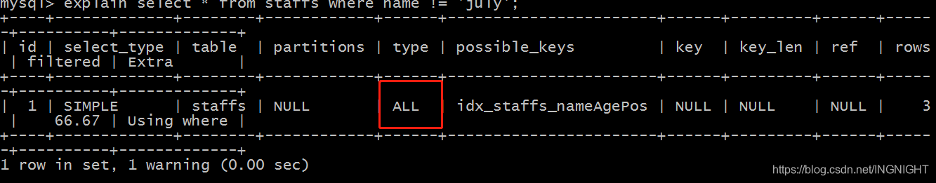 explain select * from staffs where name != 'july';
