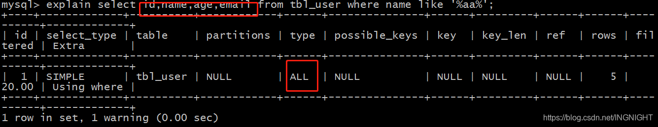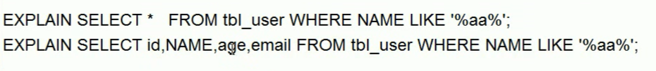 explain select id,name,age,email from tbl_user where name like '%aa%';