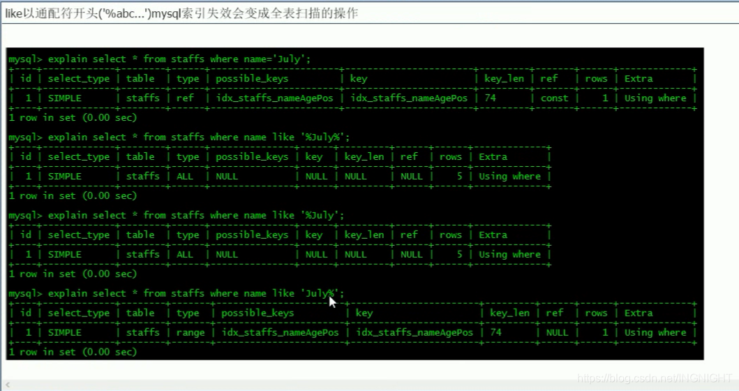 explain select *from staffs where name like '%July';