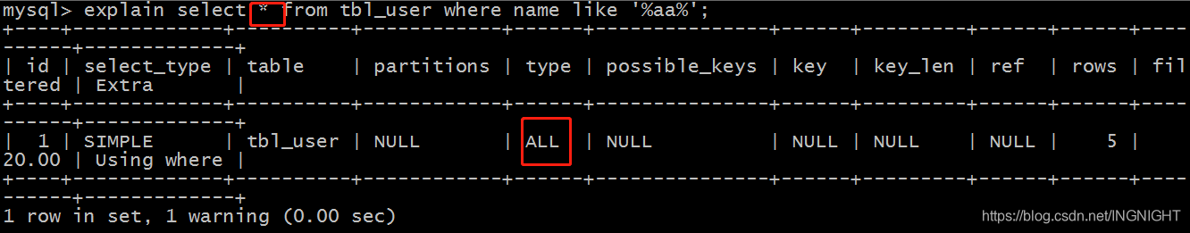 explain select * from tbl_user where name like '%aa%';