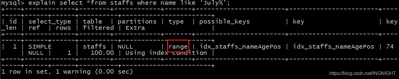 explain select *from staffs where name like 'July%';